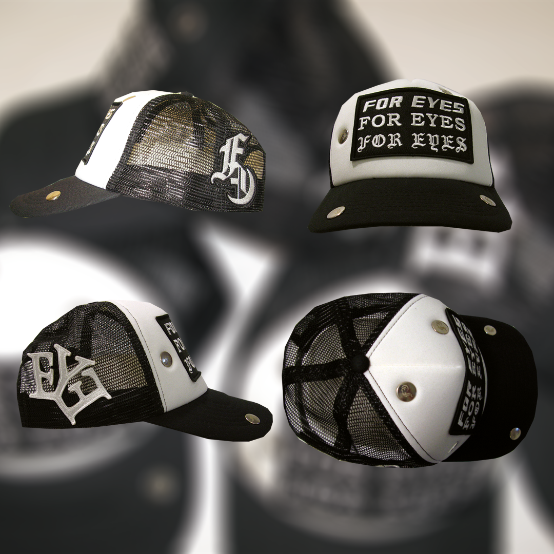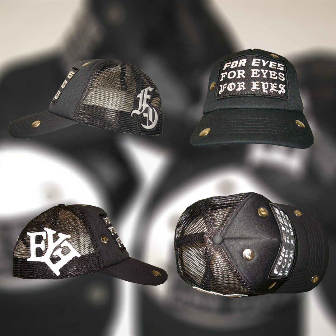 Trucker cap s třemi našivkami a druky na kterých jsou vygravírovaná loga